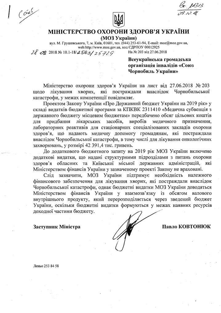 Відповідь Міністерства охорони здоров"я України на звернення щодо медичного забезпечення чорнобильців у 2019 році.